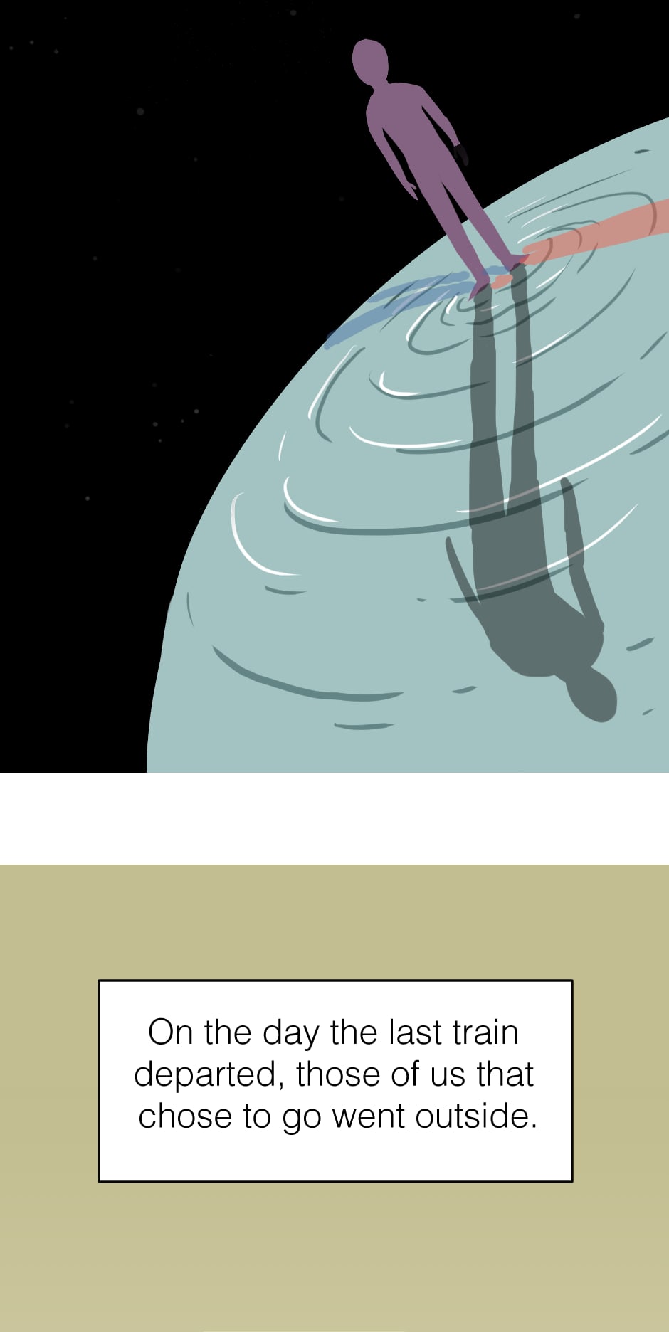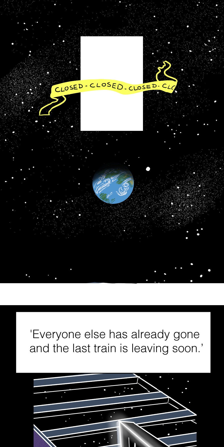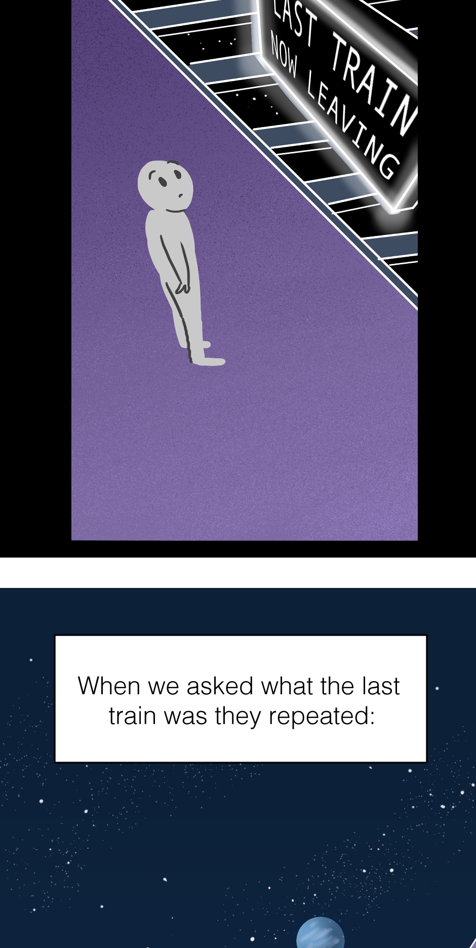 Short comic: Mysterious beings show up and alert Earth that the last train is leaving.