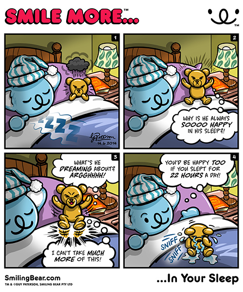 Smile More… is a kid friendly webcomic. It’s a humorous look at Smiling Bear’s happy-head life. Everything from small everyday observations, through to exciting adventure and avoidance of the dreaded Smile Stoppers. Always positive, funny with a touch of cheek!