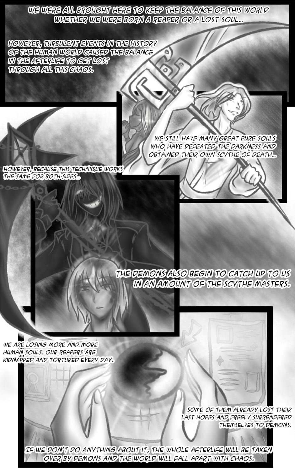 In this world, many dead souls are given a chance to atone for their sins. They’re assigned to one living human whom they’re responsible for protecting from dangerous yokai bringing bad luck and a dead soul with an ability to change into a scythe. But what happens if you miss the chance and your human dies? Future’s sealed, all you can do is to give up... or somehow deceive your fate. How far can they go? Those who no longer have neither good nor evil… those who have already lost their souls.