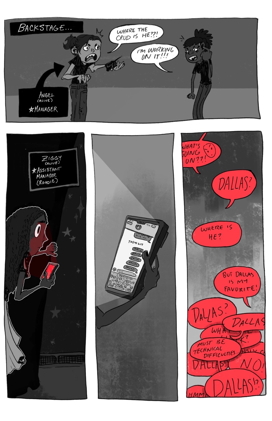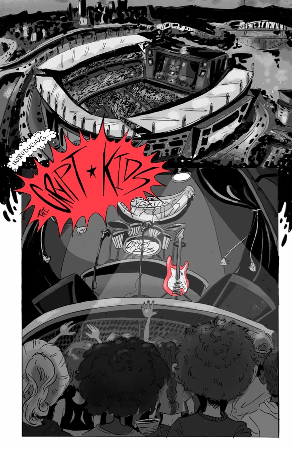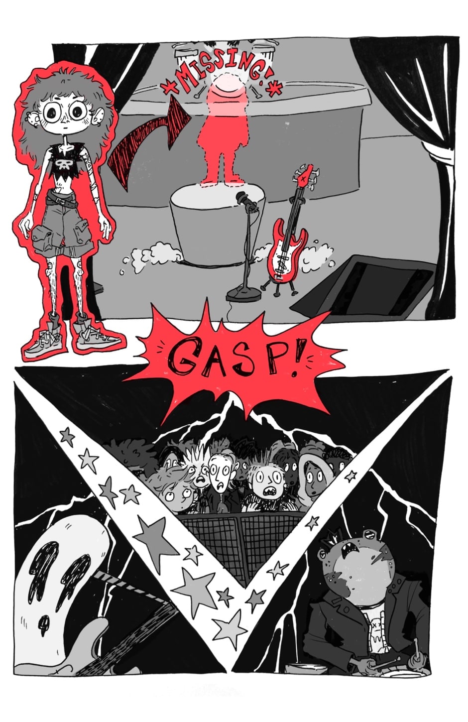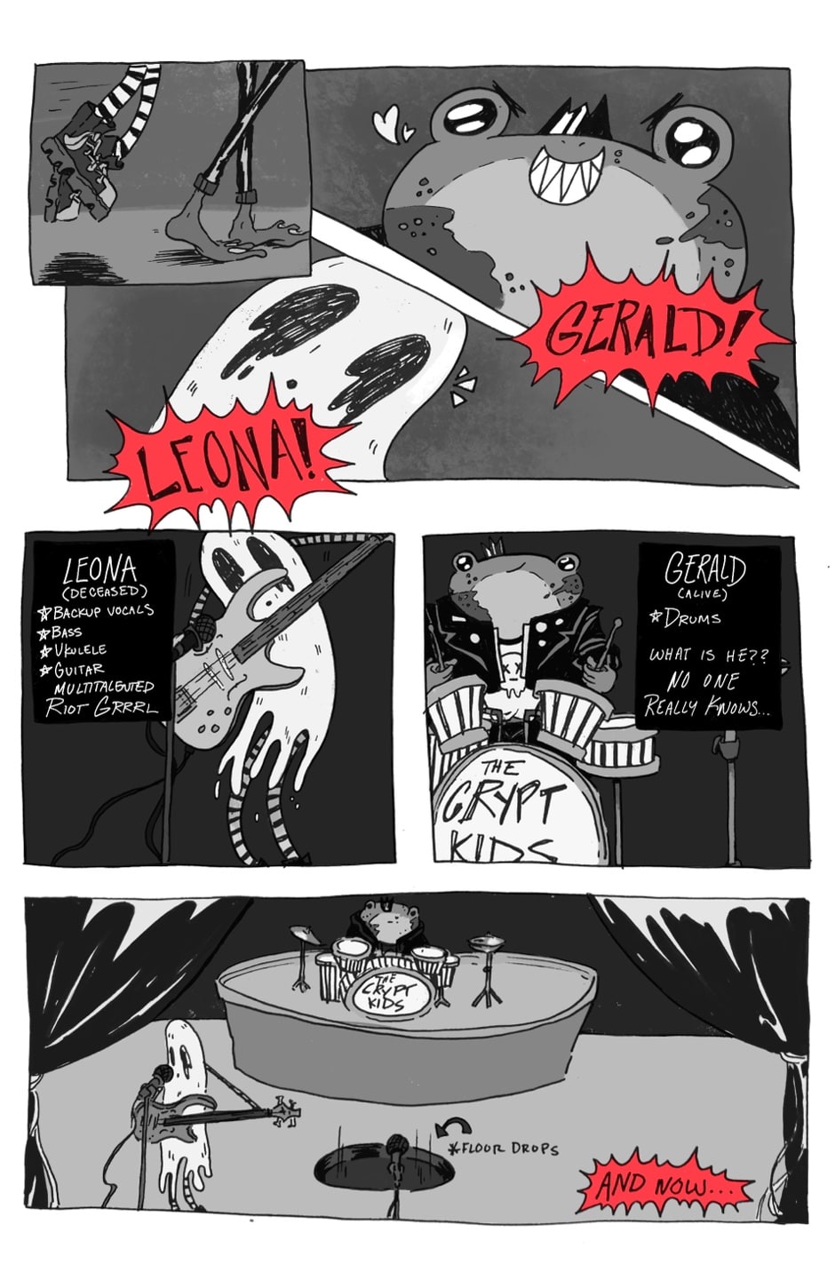 Join the Crypt Kids, a rock band of your favorite entities: a couple human teenagers, a riot grrrl ghost, and a humanoid frog-man. From humble beginnings to epic stardom, they will grapple with grief, love, friendship, and most importantly, some sick tunes! Updates every month on the 15th :)