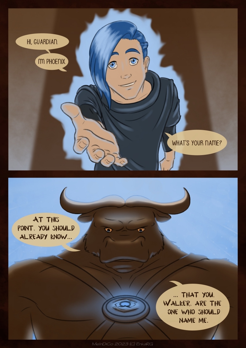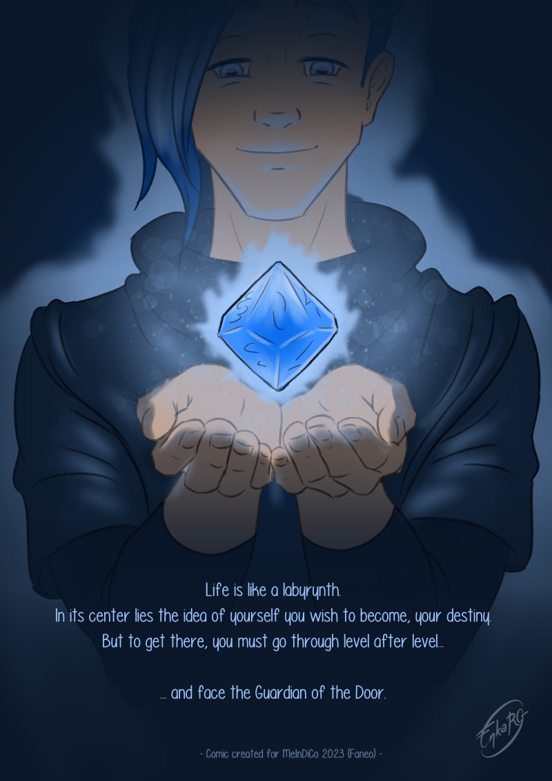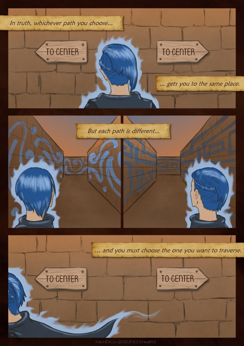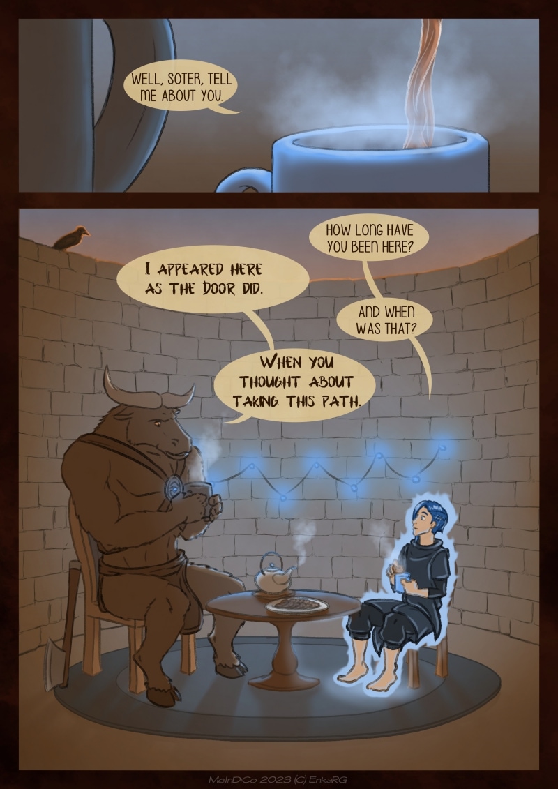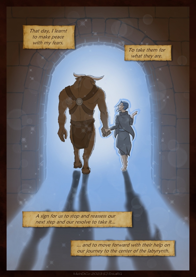 I made this comic with the idea of showing the well known metaphor of the labyrynth for our journey in life, and the minotaur as the guardian who makes sure we really are on the path we want to be in. I wanted to portray a non-binary character who could embody the essence of any person who walks forward, with their fear as an ally. And, well, also because I personally needed Phoenix to be non-binary ^^U