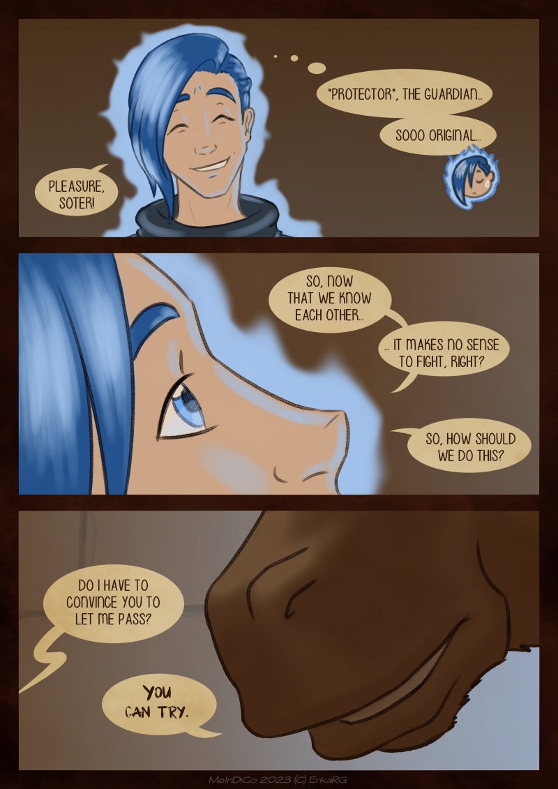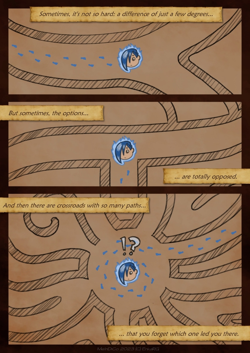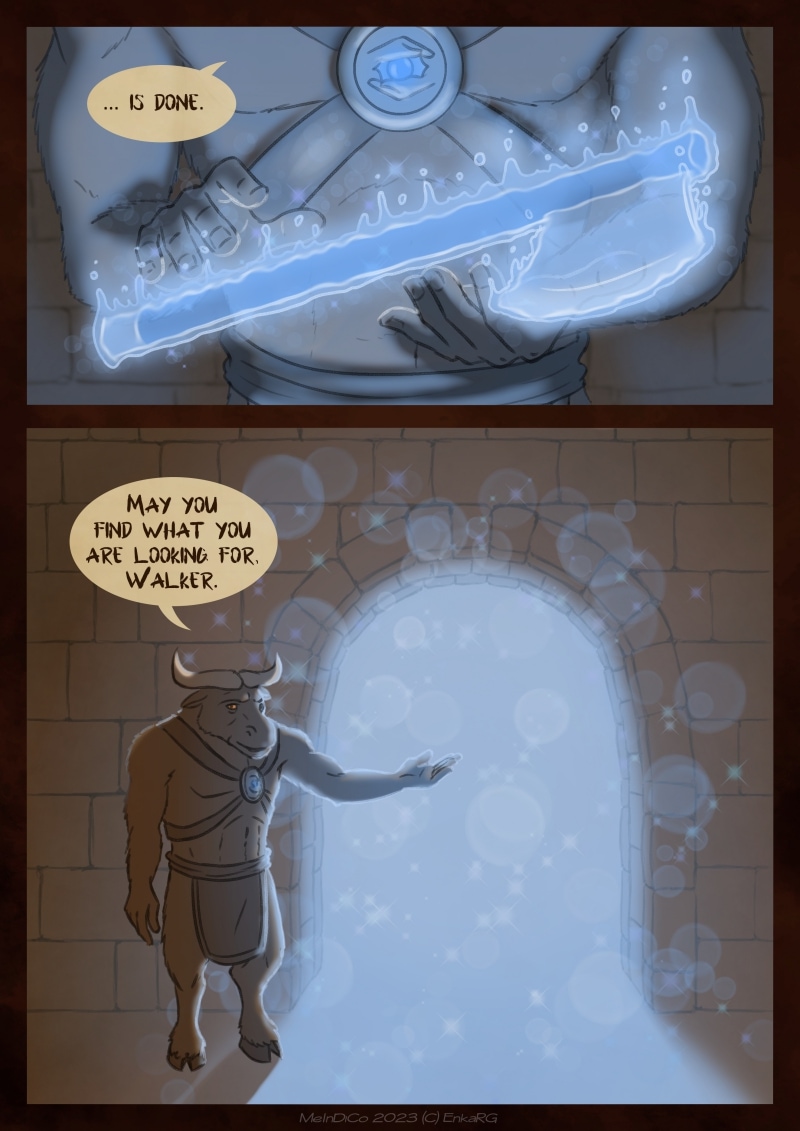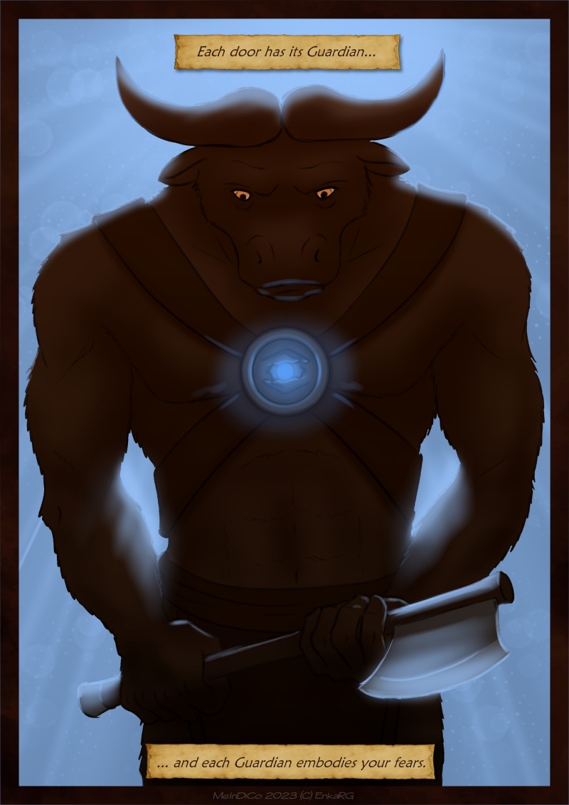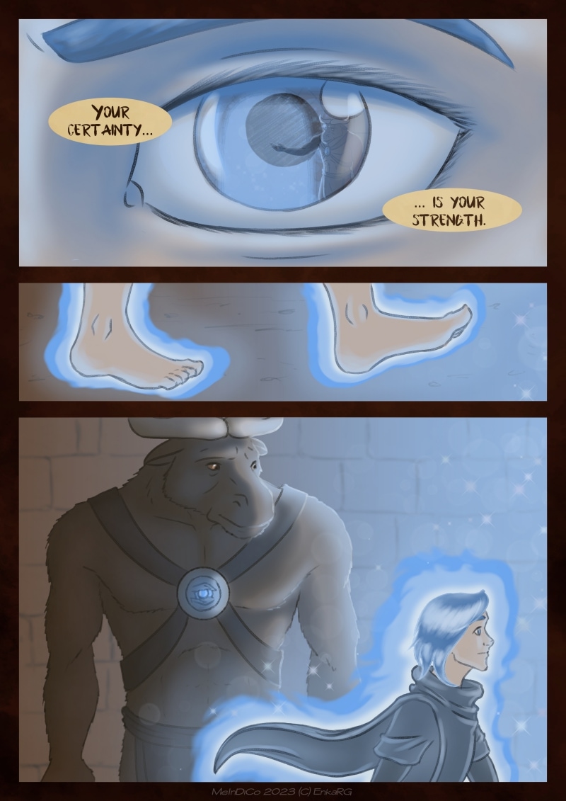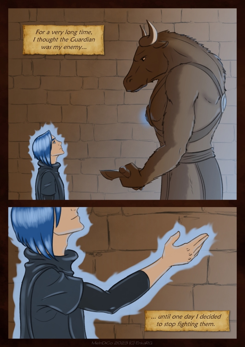 I made this comic with the idea of showing the well known metaphor of the labyrynth for our journey in life, and the minotaur as the guardian who makes sure we really are on the path we want to be in. I wanted to portray a non-binary character who could embody the essence of any person who walks forward, with their fear as an ally. And, well, also because I personally needed Phoenix to be non-binary ^^U