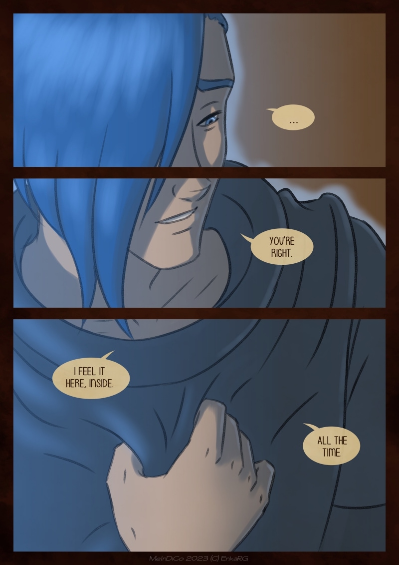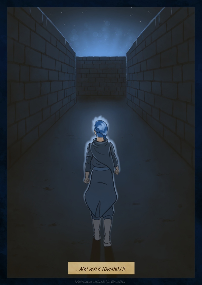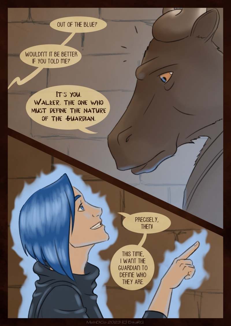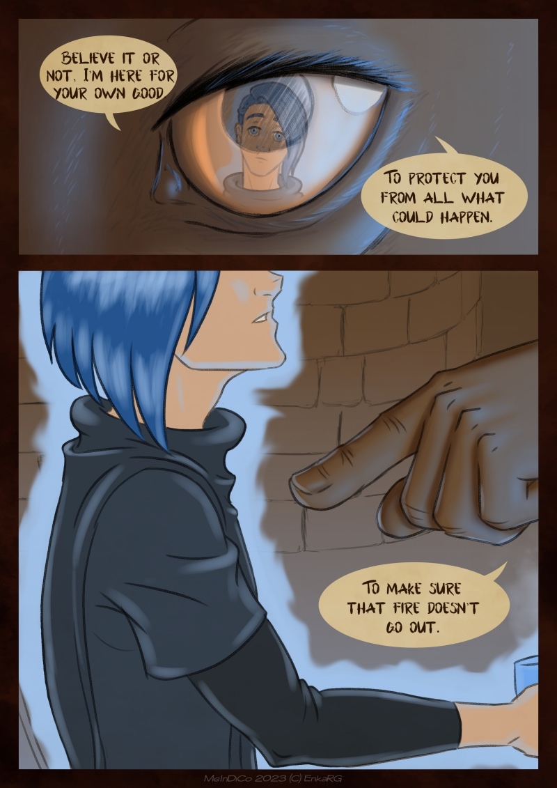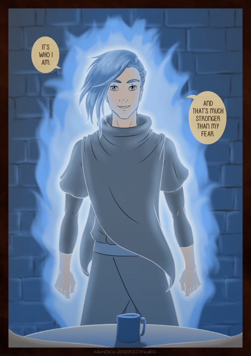 I made this comic with the idea of showing the well known metaphor of the labyrynth for our journey in life, and the minotaur as the guardian who makes sure we really are on the path we want to be in. I wanted to portray a non-binary character who could embody the essence of any person who walks forward, with their fear as an ally. And, well, also because I personally needed Phoenix to be non-binary ^^U