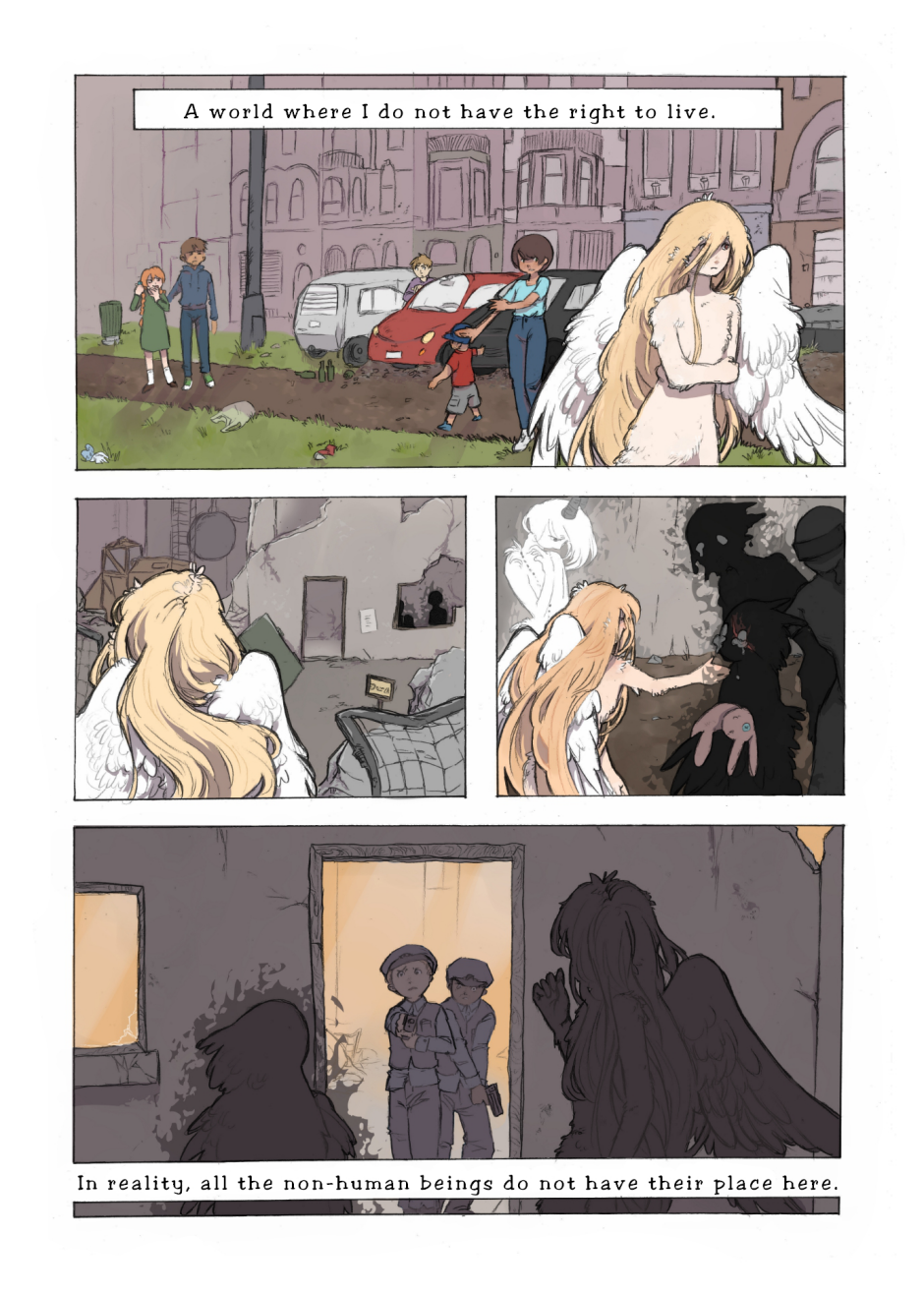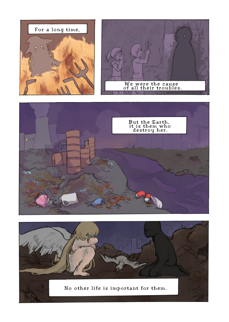 I like how the colour pallet followed the mood of the story, beginning bright and colourful and slowly getting darker and drearier as the page wears on.