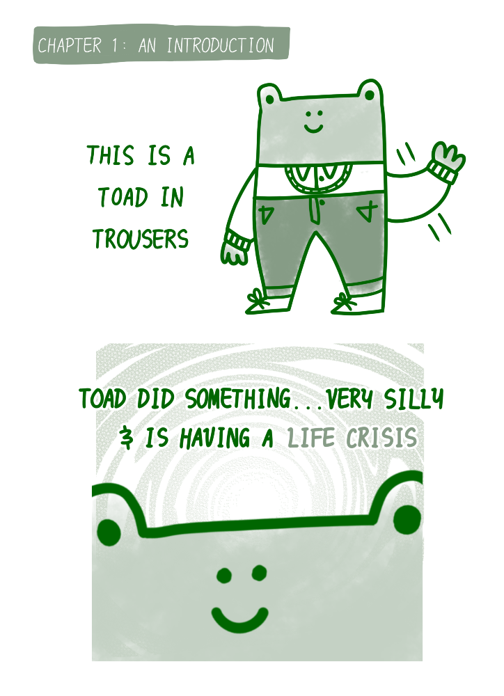 Also, welcome to my first webcomic! This is a story about a toad in trousers. Am I the toad? Is he my avatar? I don't know. Let's see where this takes me.