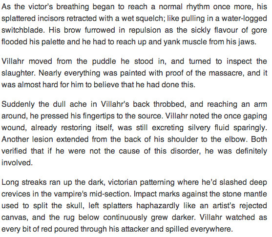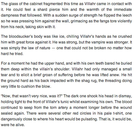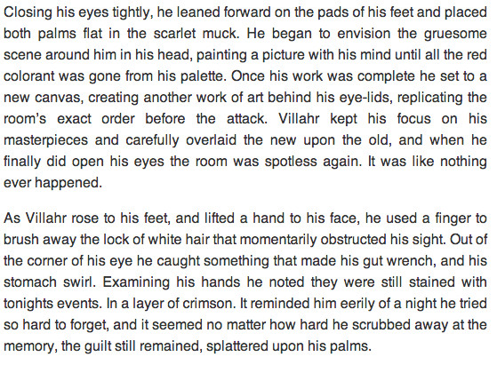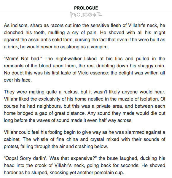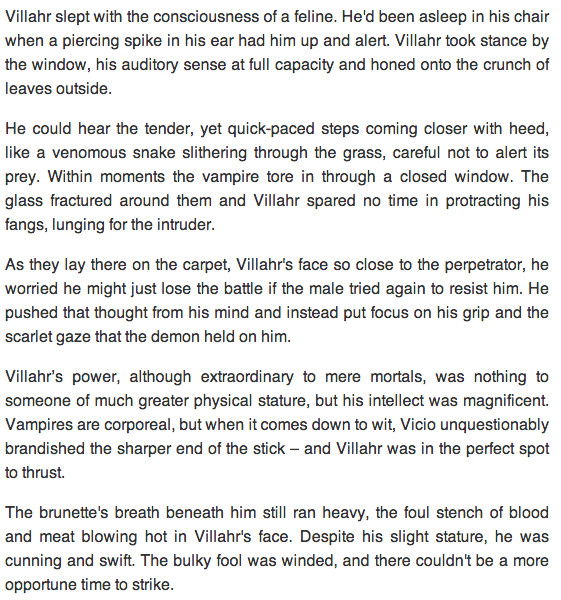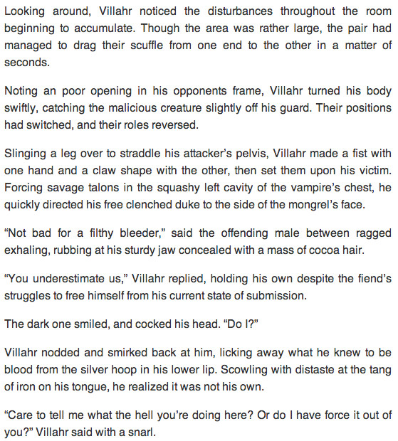 VIllahr is a tortured young Vici in a world overrun after a colossal Vampiric invasion. The earth has been completely reformatted and separated into two regions, one for the vampires and one for the humans, which is growing smaller day by day. By law it is forbidden for any of the Vampiric and Vicio species to interact, punishable by death, that is how it has always been.