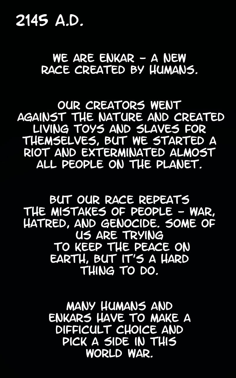 The year is 2145 A.D. We are eNKaR - a new race created by humans. Our creators went against nature and created living toys and slaves for themselves, but we started a riot and exterminated almost all people on the planet. But our race repeats the mistakes of people - war, hatred, and genocide. Some of us are trying to keep the peace on earth, but it's a hard thing to do. Many humans and eNKaRs have to make a difficult choice and pick a side in this world war.