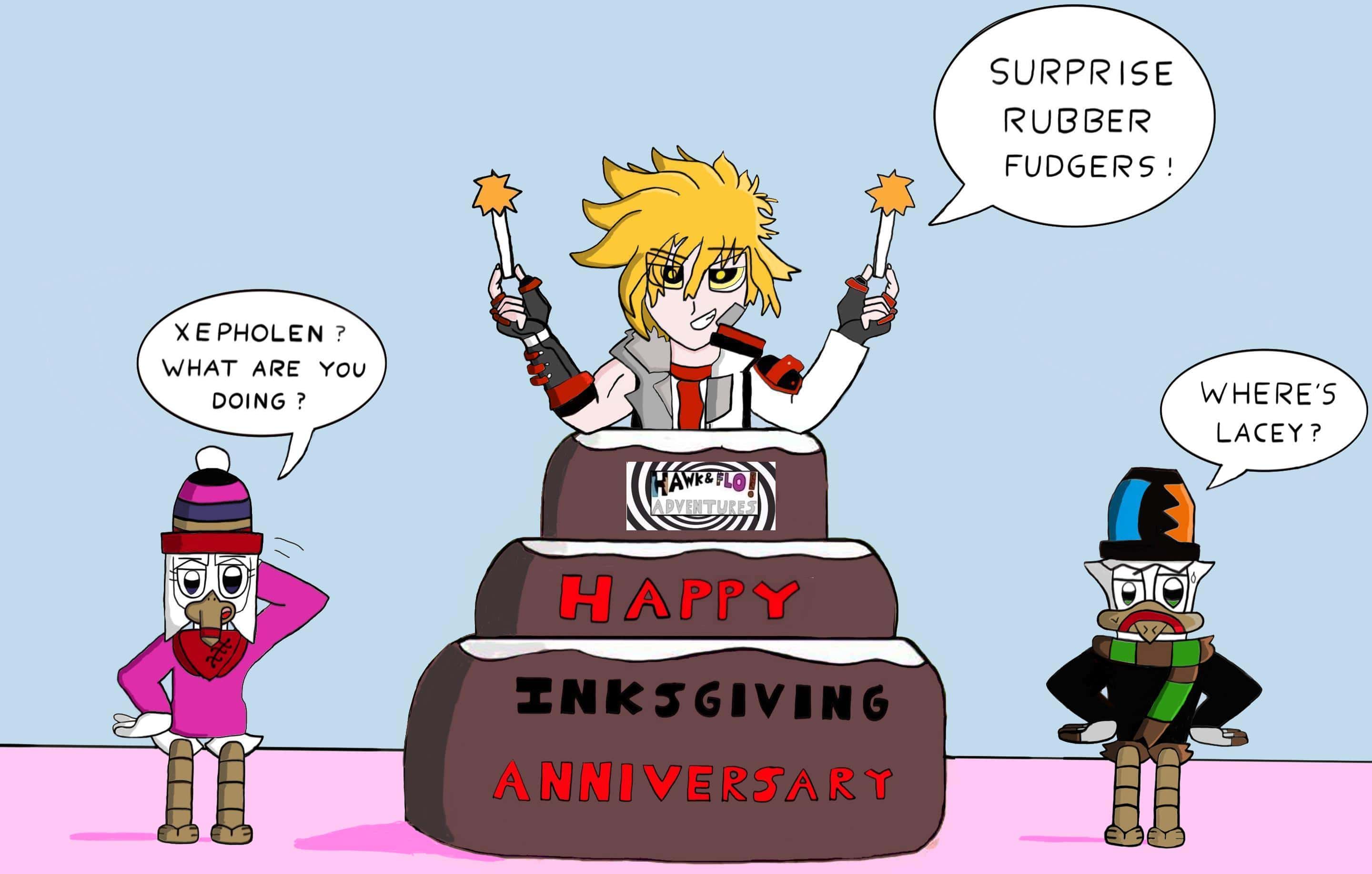 Hi I drew a Hawk and Flo Adventures/ Infinite Strike crossover Desktop. In this one Xepholen has Hijacked Hawk and Flo's usual Subscriber cake :D. I drew this to commemorate my comic's upcoming 2nd anniversary. Here's a link to my series if you're interested. ^^