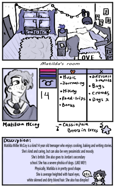 I've managed to work on introductions of characters so far so it would be a lot eaiser for everyone to differenciate between characters, and who is who! I made Matilda's introduction so far, and it is done but not in colour, BUT it is coloured in blue only. We have a break week soon, so I will work on it and post a lot when things are done! Also, If you've noticed I have added a Twitter account, I will soon post stuff on it, so make sure to check if any updates or silly drawings I've decided to make.