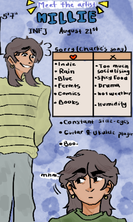 I made a little 'Meet the Artist' thing. Again, so sorry I'm not posting much! I'll try my best during break week to make big updates for the comic and not random drawings!
